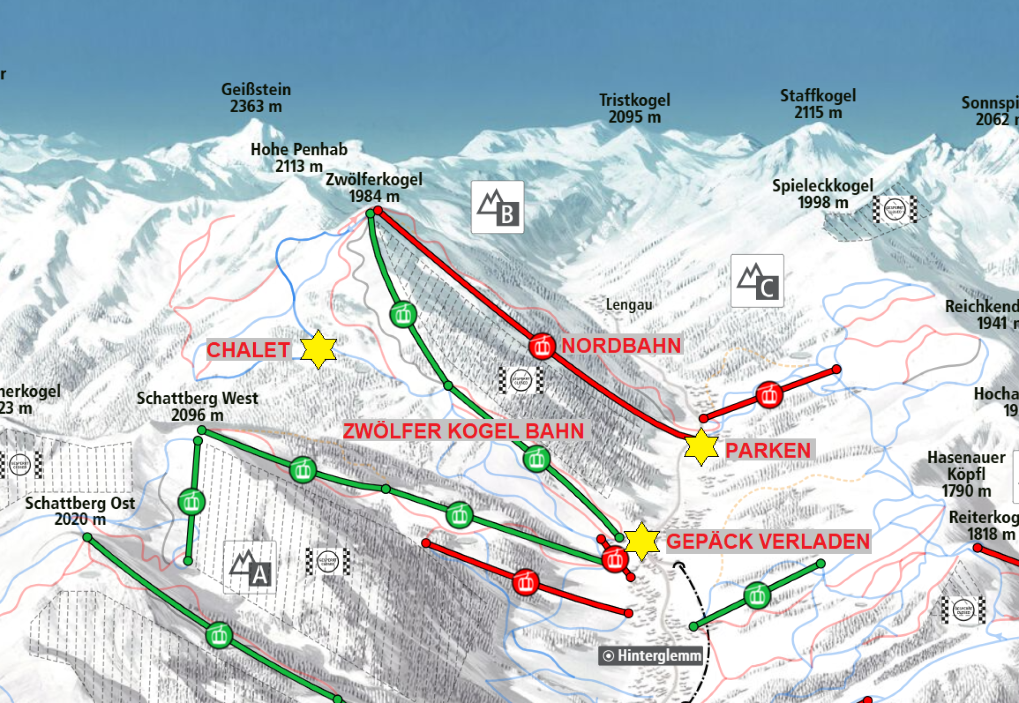 Unser Chalet liegt direkt an der Ski Piste Nr. 30, hoch oben am Zwölferkogel auf 1740m Seehöhe.