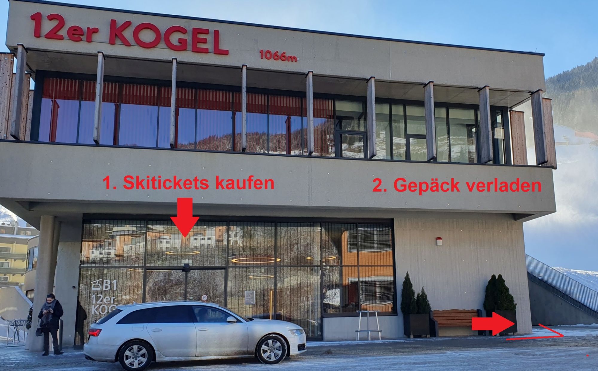 Gepäck bei der Zwölferkogel Talstation in die Trolleys laden und Skipässe kaufen.